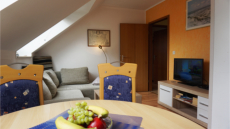 Das Wohnzimmer ist mit einer gemütlichen Couchgarnitur, einer Essecke für vier Personen, TV und Radio